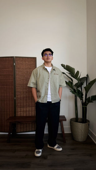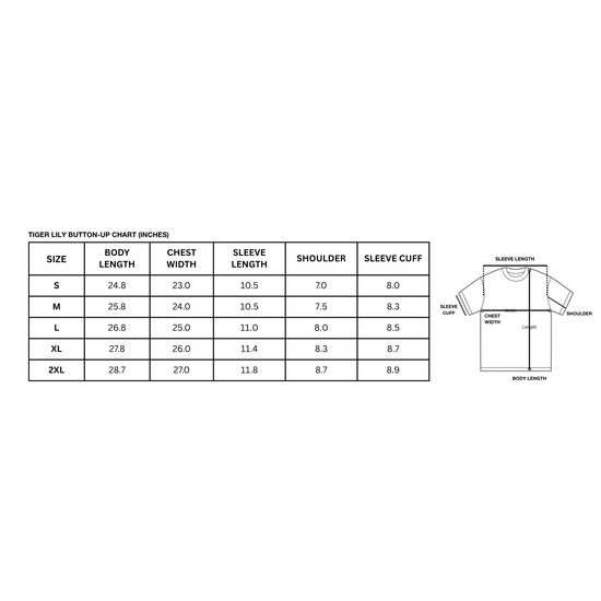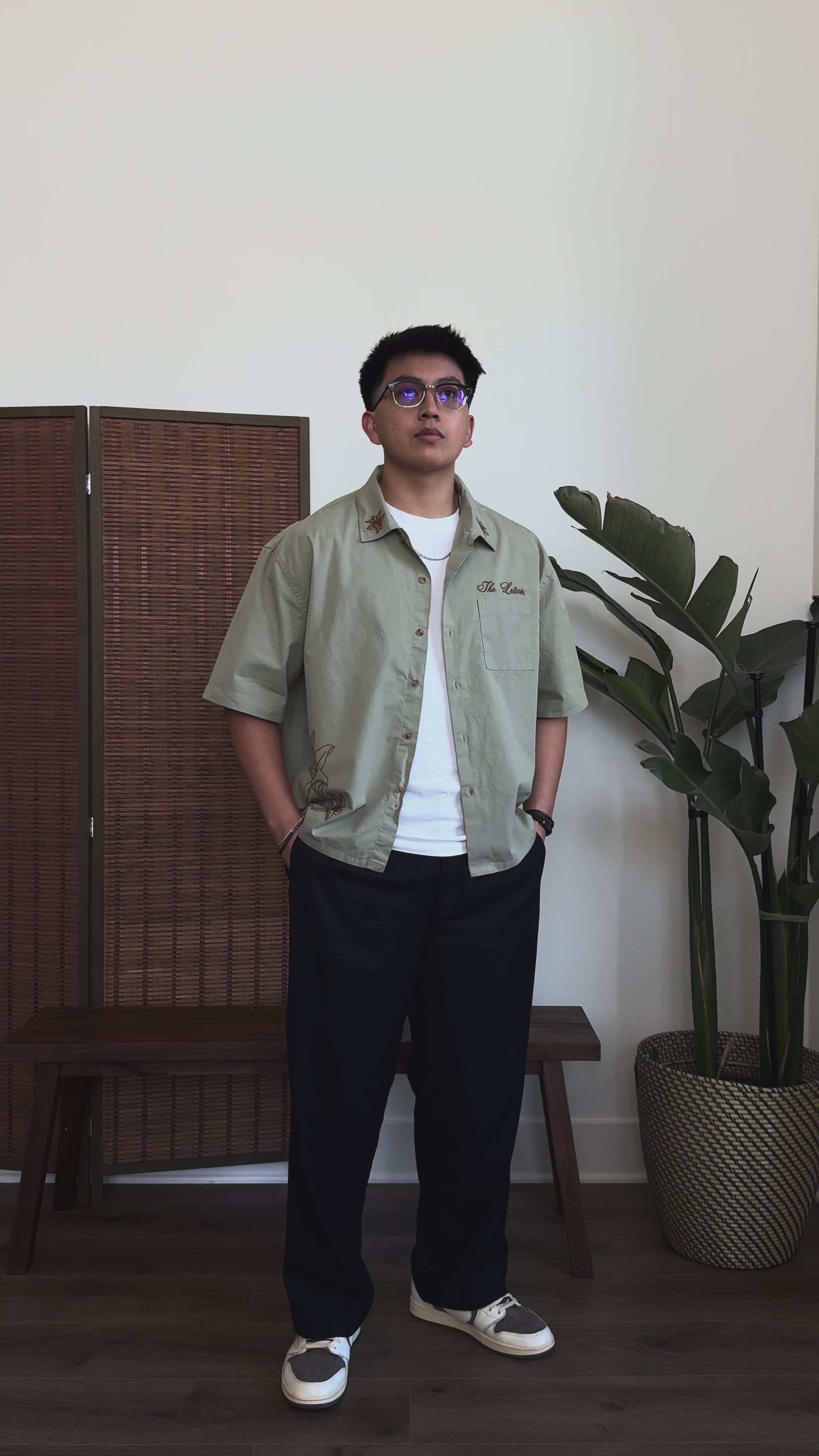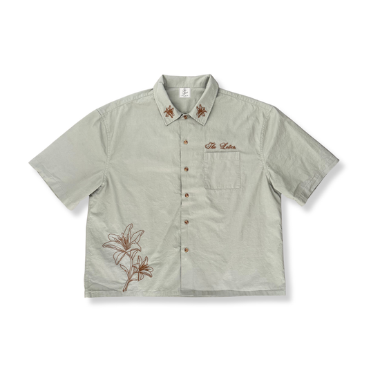 A clean sage button-up with embroidered tiger lilies on the collar, hem, and back.
